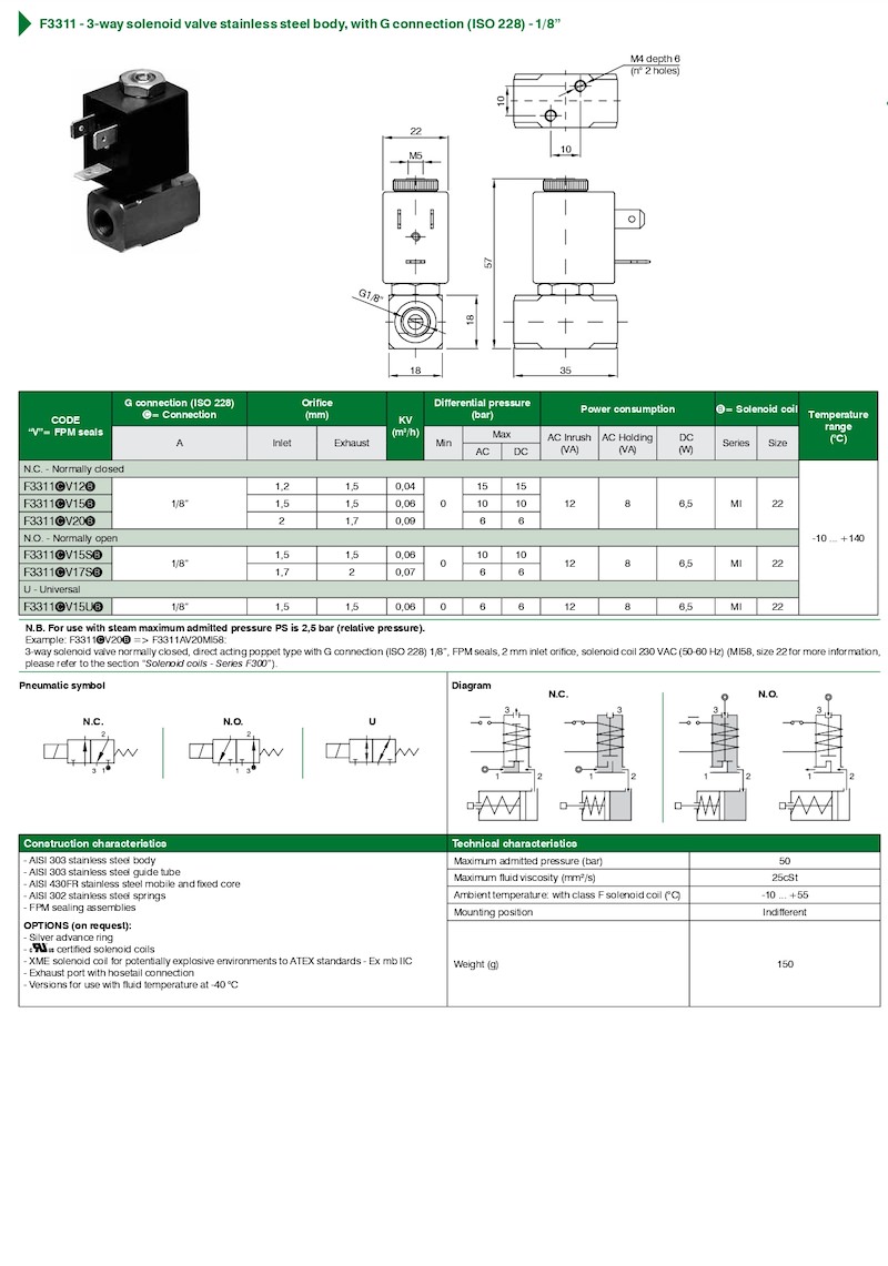 F3311 – 3-way solenoid valve stainless steel body, with G connection (ISO 228) – 1/8”