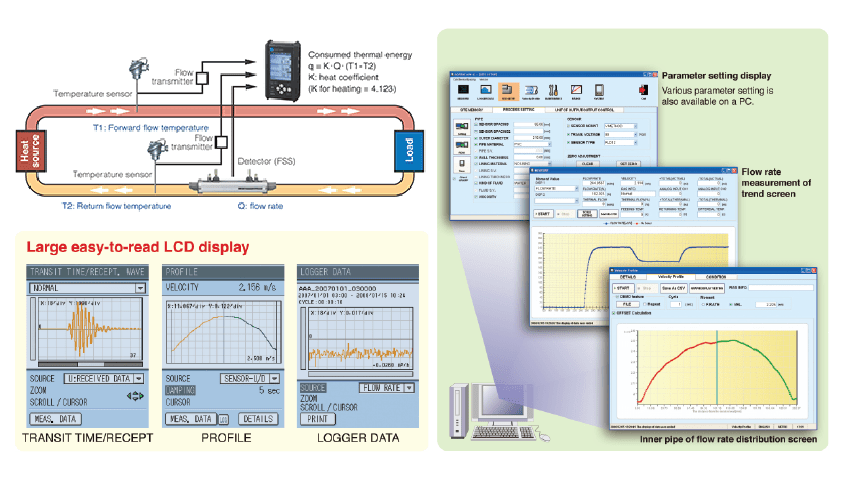 | Functions | Damping time constant (0–100 s) Instantaneous value display (10 digits) Various flow rate unit settable Total value display (10 digits) Various flow rate unit settable Consumed heat quantity computation Self diagnosis (battery voltage drop and received waveform from the sensor) Flash memory (parameters of pipe, fluid, sensor, etc) Number of registration sites: 32 Zero point adjustment (by setting/clearing zero) Graph view, waveform view Bi-directional flow measurement Low-flow cutoff (0–5 m/s) |